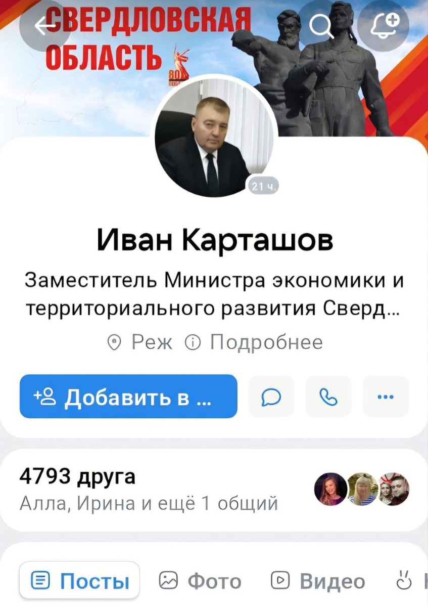 Ложные сведения распространены экс-мэром Карташовым на его личной станице Вконтакте: замминистра экономики Свердловской области он якобы