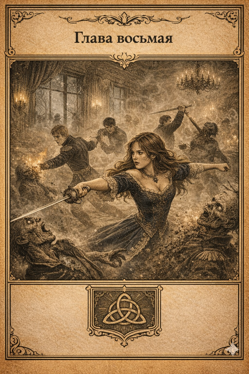 Упыри, неведомо откуда возникшие, врывались в дом. Танцующие обернулись в ужасе, кто-то упал, кто-то бросился к дверям. Несколько фигур уже сцепились в схватке с уланами. Иларион с гусарами выдергивали шпаги. В зале звенела сталь.