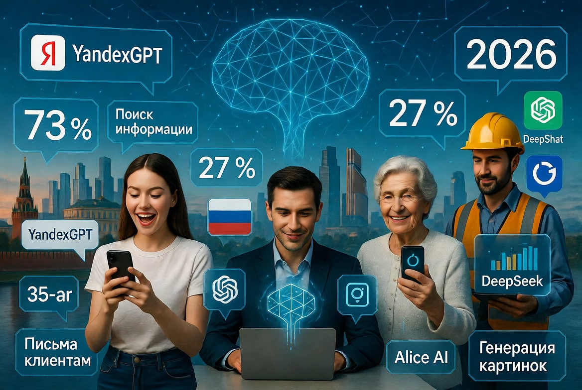Февраль 2026 года. Искусственный интеллект окончательно перестал быть «технологией будущего» и стал повседневным инструментом для миллионов обычных россиян. Два ключевых исследования 2026 года — ВЦИОМ (январь) и hh.ru (февраль) — дают чёткую картину: ИИ активно используют и на работе, и в быту, причём проникновение идёт во все возрастные группы и профессии. (ВЦИОМ, 20 января 2026, опрошено 1625 человек 18+, онлайн-панель, погрешность ≤3,1 %) Это самый высокий показатель за всю историю наблюдений. Генеративный ИИ больше не экзотика — он встроен в повседневную жизнь: люди генерируют тексты, изображения, видео, музыку, решают рутинные задачи и создают контент. При этом россияне пока не всегда уверенно отличают, где человек, а где ИИ: (hh.ru, 20 февраля 2026) Это самое свежее и детальное исследование именно про обычных работающих людей (не только IT-специалистов). Частота использования среди тех, кто уже применяет ИИ: 45 % пока не используют, но хотели бы начать.