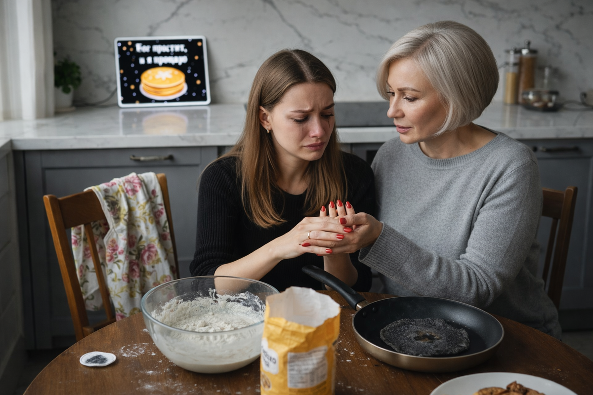 Анна прошла на кухню. На столе стояла миска с серым, комковатым тестом. Рядом — открытая пачка муки, та самая, которую она критиковала в магазине. На сковородке лежал первый блин — рваный, пригоревший, похожий на клочок грязной ветоши.
