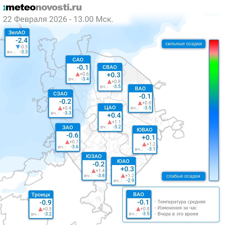 В 13:00 в Москве было от -2.8°C до +0.8°C, средняя температура -0.2°C #погода #Москва #зима #температура #22февраля #воскресенье