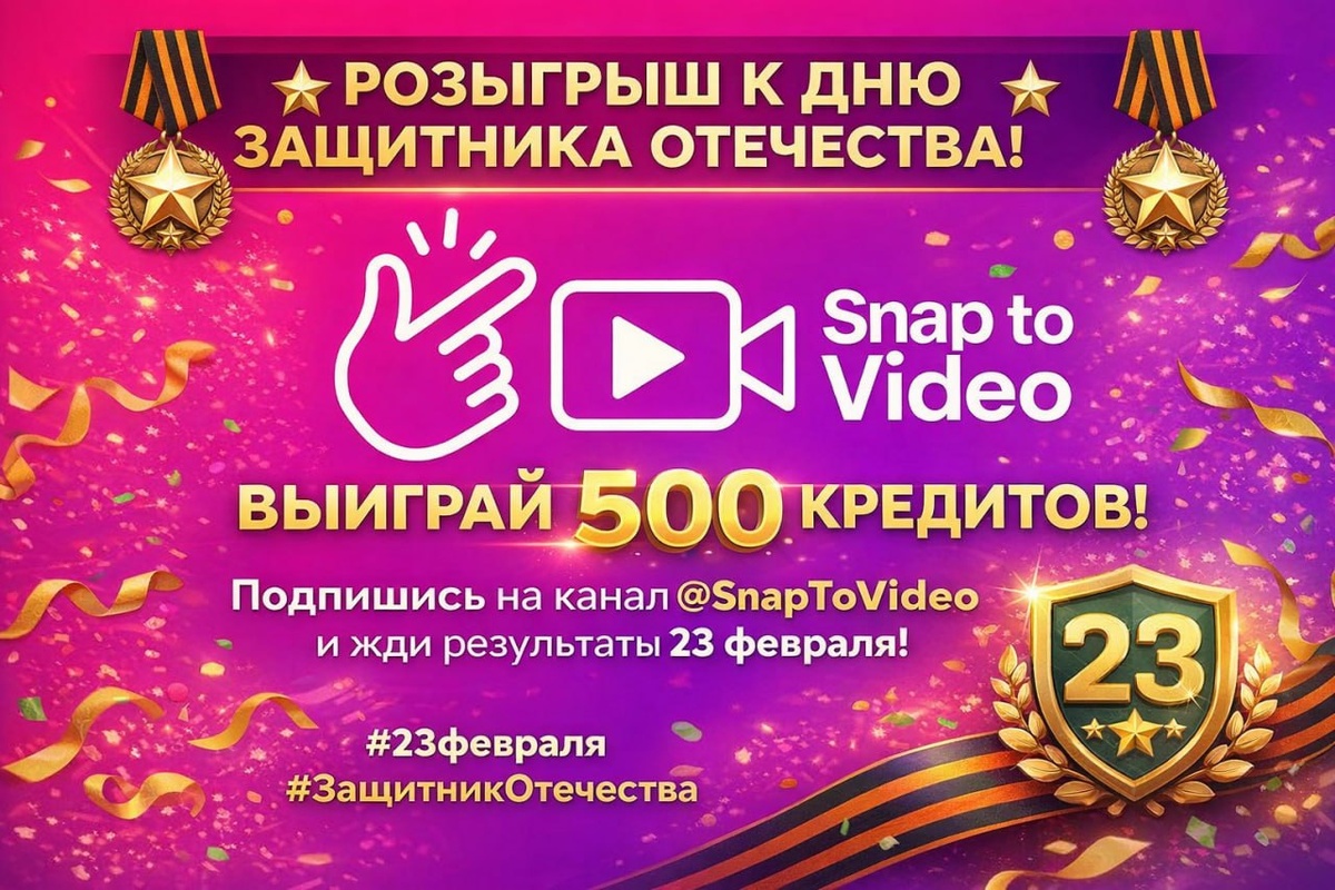 ! 🎖 Завтра в 20:00 состоится объявление победителя розыгрыша 500 кредитов. Приз будет зачислен победителю на баланс в нашем чат-боте @SnapToVideo_bot. Не пропусти удачу! Подробности на канале. Участвуй https://t.me/snaptovideo/776