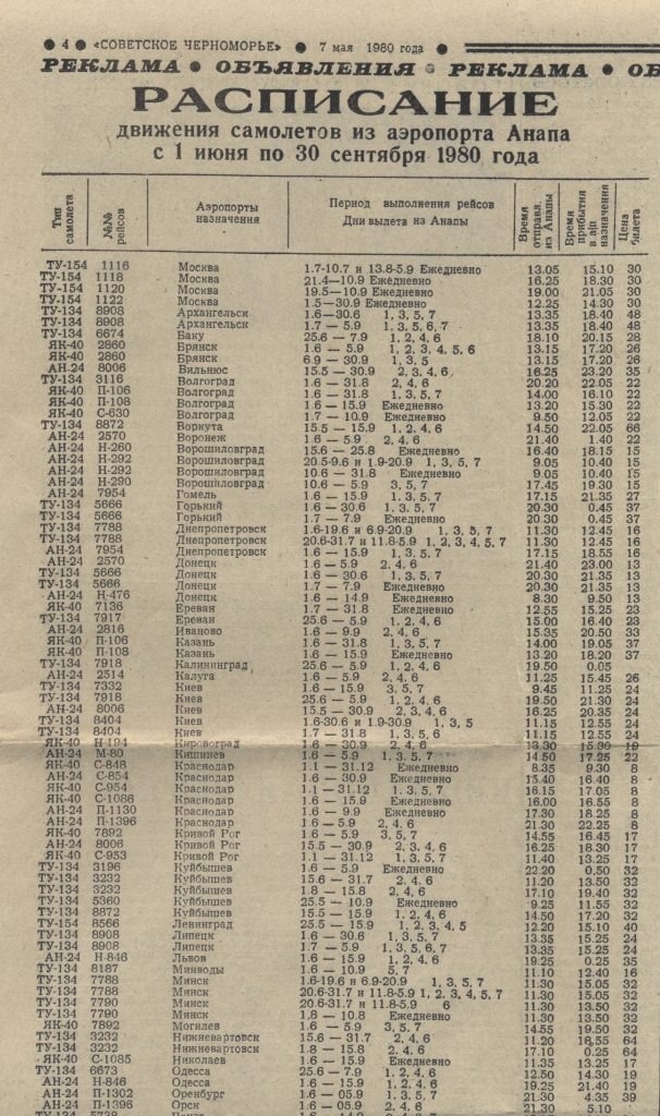 Летнее расписание полётов аэропорта Анапы 1980 года✈️