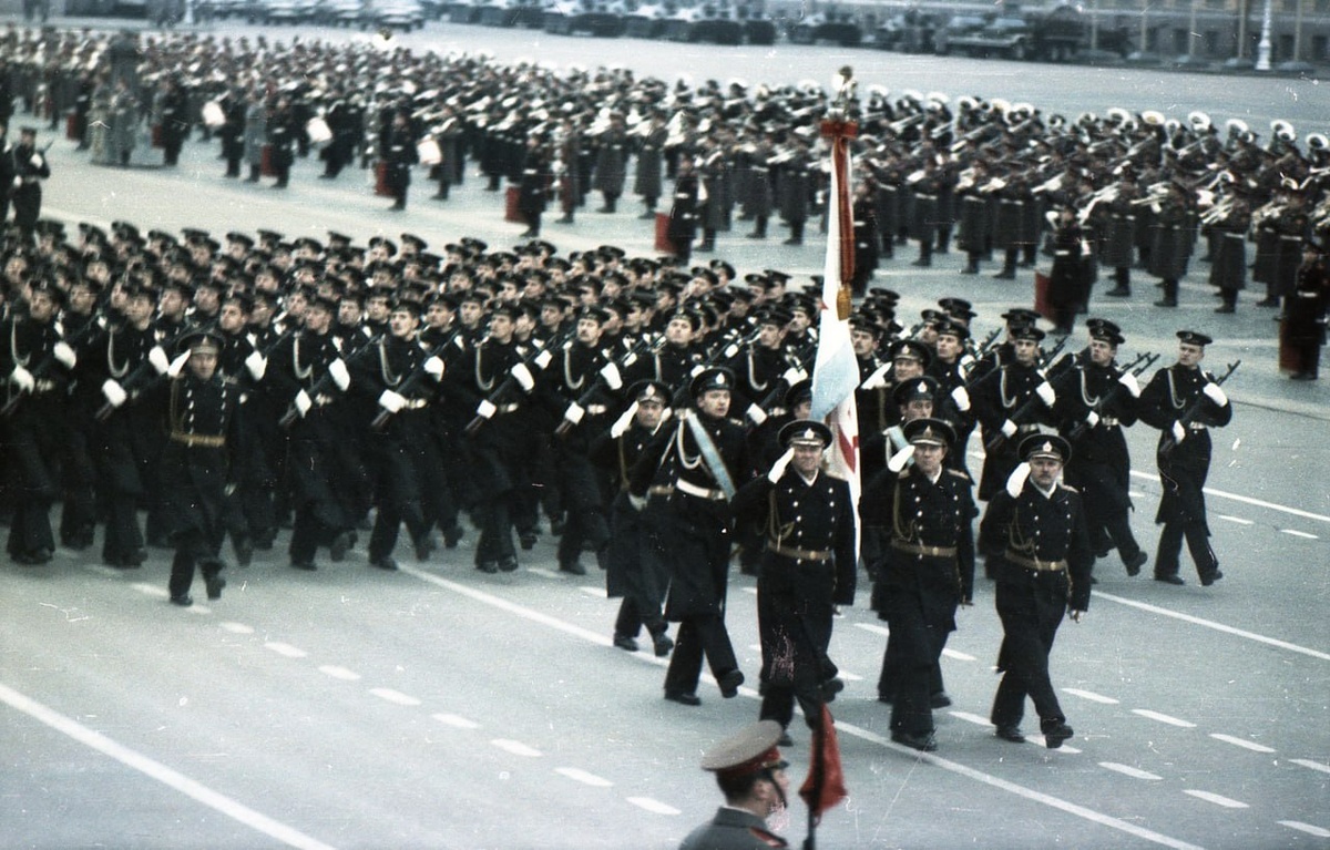 Парад войск Ленинградского гарнизона на Дворцовой площади 7 ноября в честь Великой Октябрьской Социалистической революции в 1986 году