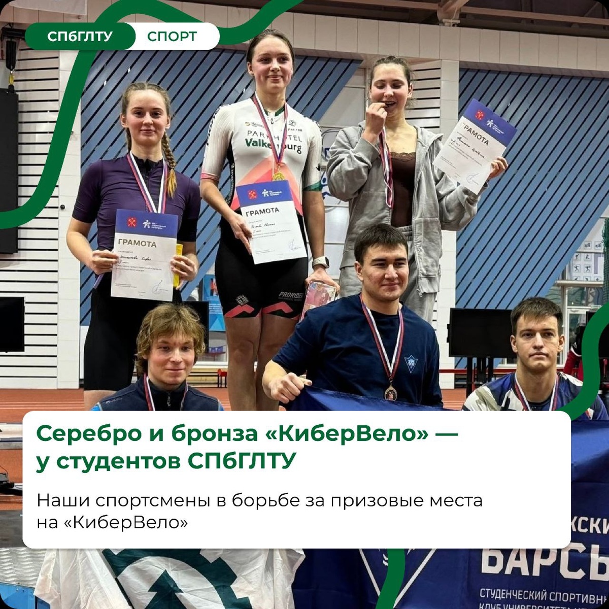 ! 15 февраля прошли студенческие соревнования Санкт-Петербурга по велосипедному спорту «КиберВело». В этом сезоне состав участников обновился и вырос до 80 человек, а организаторы впервые провели индивидуальную гонку вместо групповой — спортсменам пришлось срочно менять тактику! Наши результаты: 🥈 Всеволод Косицкий, Институт леса и природовользования — 2 место (мужчины) 🥉 Изабелла Фишман, Институт леса и природовользования — 3 место (женщины) В шаге от пьедестала: 4 место — Матвей Манжула, Институт ландшафтной архитектуры, строительства и обработки древесины. В составе сборной также выступили: • Лобанова Екатерина, Институт химической переработки биомассы дерева и техносферной безопасности. • Мочалов Ярослав, Институт ландшафтной архитектуры, строительства и обработки древесины. • Уткин Владислав, Институт химической переработки биомассы дерева и техносферной безопасности. Напряжённая борьба, секундные разрывы и полная самоотдача — наши спортсмены показали характер! Поздравляем
