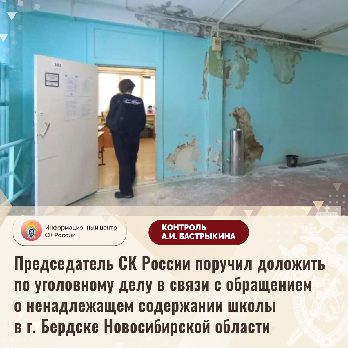 Председатель СК России поручил доложить по уголовному делу в связи с обращением о ненадлежащем содержании школы в г. Бердске Новосибирской области В Информационный центр СК России поступило обращение жителей Новосибирской области по вопросу ненадлежащего состояния здания одного из образовательных учреждений города Бердска. На протяжении длительного времени кровля строения 1988 года постройки протекает, со стен осыпается штукатурка, температурный режим в классах не соответствует установленным нормам. При этом капитальный ремонт учебного заведения ни разу не проводился. Обращения в различные инстанции результатов не принесли. В СУ СК России по Новосибирской области возбуждено уголовное дело. Председатель Следственного комитета Российской Федерации Александр Иванович Бастрыкин поручил руководителю СУ СК России по Новосибирской области Евгению Геннадьевичу Долгалеву доложить о предварительных и окончательных результатах расследования уголовного дела. Исполнение поручения поставлено на кон