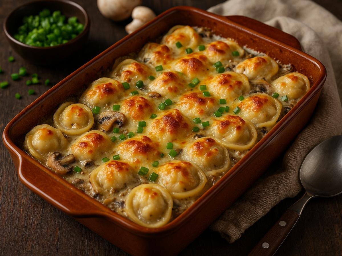 · С грибами: Добавьте слой обжаренных шампиньонов между пельменями и луком.