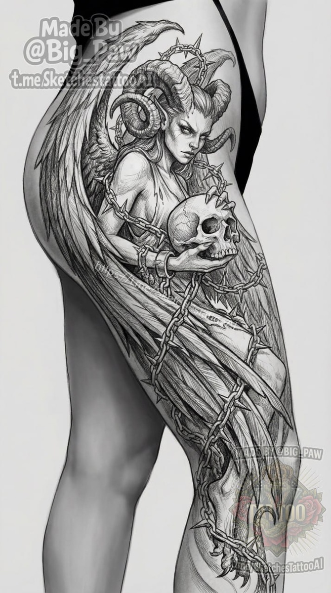 шипов/цепей, в руках чтобы она держала череп. Расположение как на примере, на все бедро начиная от бока и до колена 🧠 SYNTX - тут создан эскиз 💎 Информация - все услуги 💀 Эскизы от нейросети 😎 Удалить тату - прайс #наногу #девушка #гарпия #эскиз #тату #татуировка