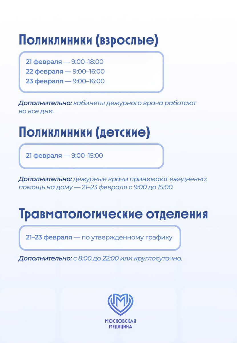 ⏺Поликлиники будут принимать пациентов все три дня, включая 23 февраля, – с сокращенным временем работы, но с обязательным присутствием дежурных врачей. ⏺Центры госуслуг "Мои документы" закроются только на один день, а уже 24 февраля вернутся к обычному графику. ⏺Экстренные службы и телефоны психологической помощи останутся на связи круглосуточно.