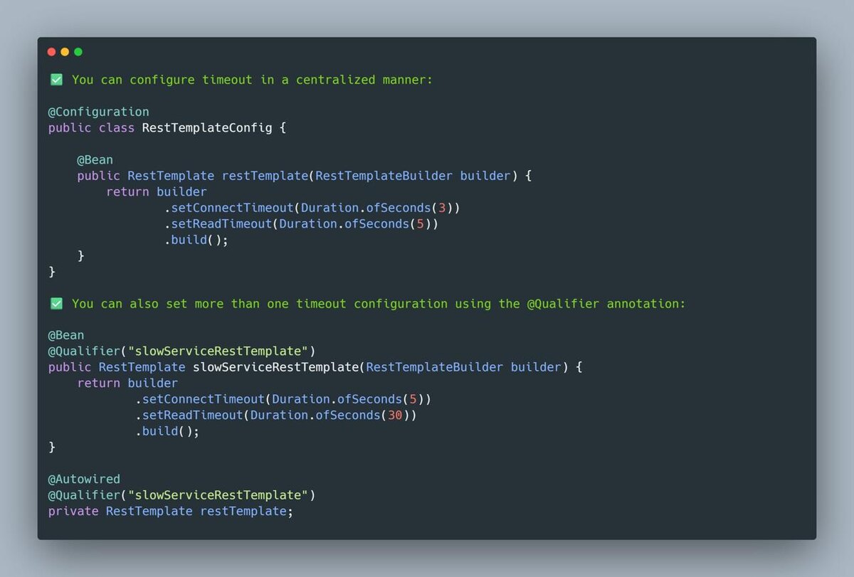 Если в проекте много REST-запросов через RestTemplate, не разбрасывай таймауты по коду. ✅ Правильнее сделать конфигурацию через RestTemplateBuilder: - один общий RestTemplate с дефолтными timeout - плюс отдельные клиенты под “медленные” сервисы (через `@Qualifier`) Так у тебя: - единая точка настройки - меньше багов в проде из-за “вечных” запросов - проще дебажить и менять параметры 💡 Особенно полезно в микросервисах, где внешние сервисы могут подвисать. #SpringBoot #JavaDev