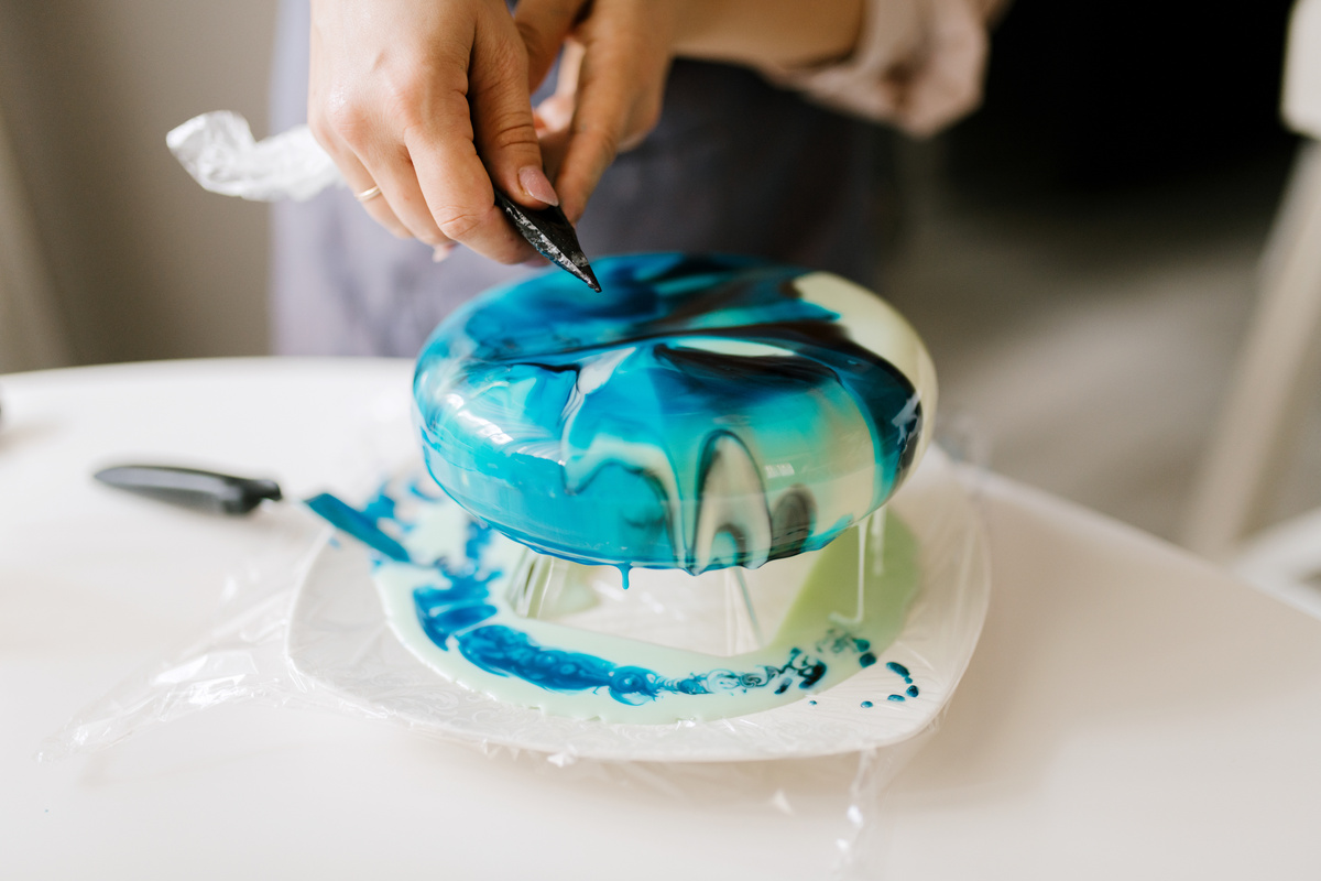 3. Доводим сироп до кипения и нагреваем до 100 – 103 градусов, выливаем его на шоколад со сгущёнкой, добавляем набухший желатин. Пробиваем блендером до однородности (минимум 2минуты). Добавляем краситель, пробиваем для получения необходимого цвета.
