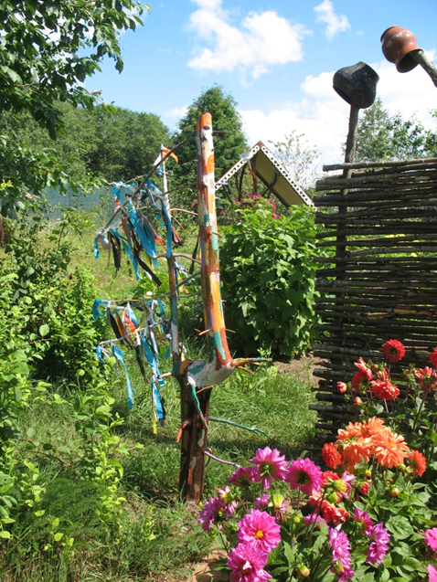 Ходили с ребятами по лесному огороду за грибами. На обратном пути приметная ёлочка была, с двумя стволами, небольшая. Ребята знали, что от неё до дома метров триста осталось. Засыхать она стала. Однажды возвращаемся с грибов, а ёлка упала, подгнил ствол у земли. Забрали с собой. Лишнее отпилили. Детвора раскрасила, ленточек навязали. Получился петух. Будильник привяжи, будет в нужное время кукарекать.
