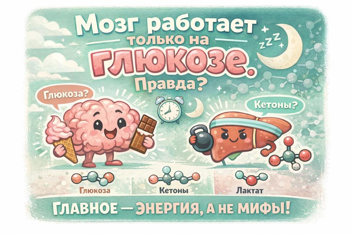Правда? Очень удобная фраза. Особенно когда хочется объяснить: «мне срочно нужно сладкое, это для мозга». Но давайте без крайностей. Да, в обычных условиях мозг использует глюкозу. Поели ➡️ глюкоза поступила ➡️ мозг доволен. Но если углеводов мало, если ты не ешь несколько часов, если ты спишь или временно снижаешь углеводы — мозг не отключается. Он переключается. Печень делает из жирных кислот кетоновые тела. И мозг спокойно использует их как топливо. Через несколько дней снижения углеводов до 60–70% энергии может идти именно из кетонов. Жир напрямую мозг не использует, но его переработанную форму — да. Иногда при нагрузке мозг может использовать и лактат. То есть вопрос не в «только глюкоза». Вопрос в энергии. И важный момент. Я не «за кето». И не «за углеводы». Я против мифов. Мне неинтересно воевать лагерями. Мне важно, чтобы вы понимали, как устроена физиология. Когда вы тянетесь за сладким это не всегда «мозгу срочно надо». Часто это про режим, стресс, кортизол, скачки са