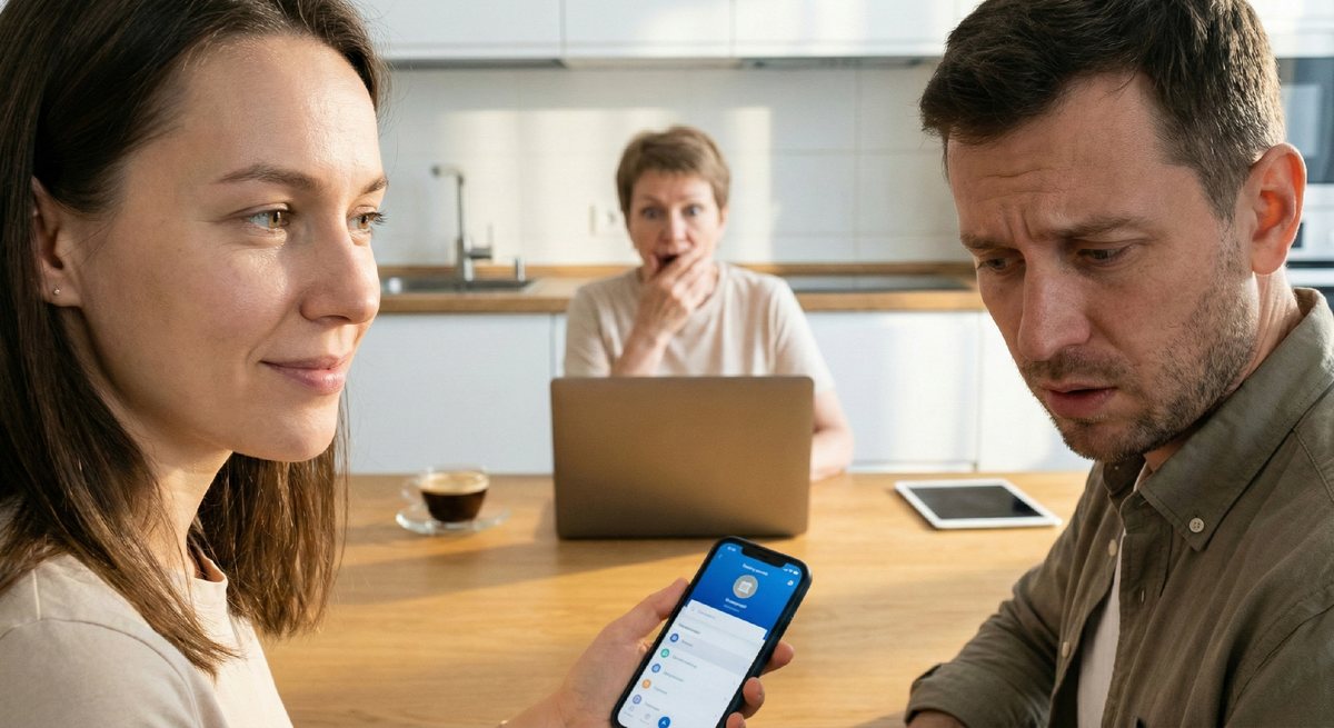 Полина неторопливо сняла пальто, помыла руки, прошла на кухню и села напротив свекрови. Она достала из сумочки свой телефон, открыла банковское приложение и положила экраном вверх перед Антоном и Тамарой Васильевной.