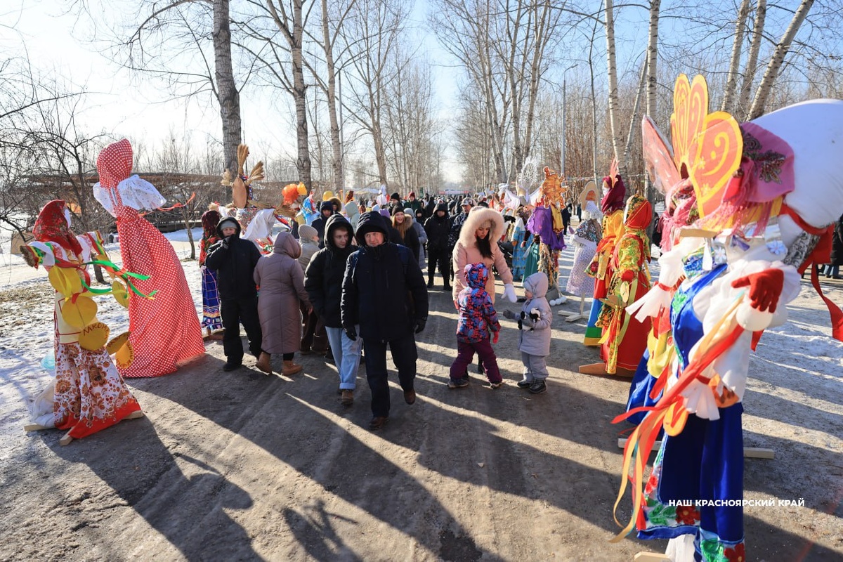 Сотни горожан и гостей центра посетили праздник. Для посетителей работали ярмарки, выступали творческие коллективы и устраивали народные забавы. Кульминацией мероприятия стало сожжение чучела Масленицы. Фото: «Наш Красноярский край» ТВК