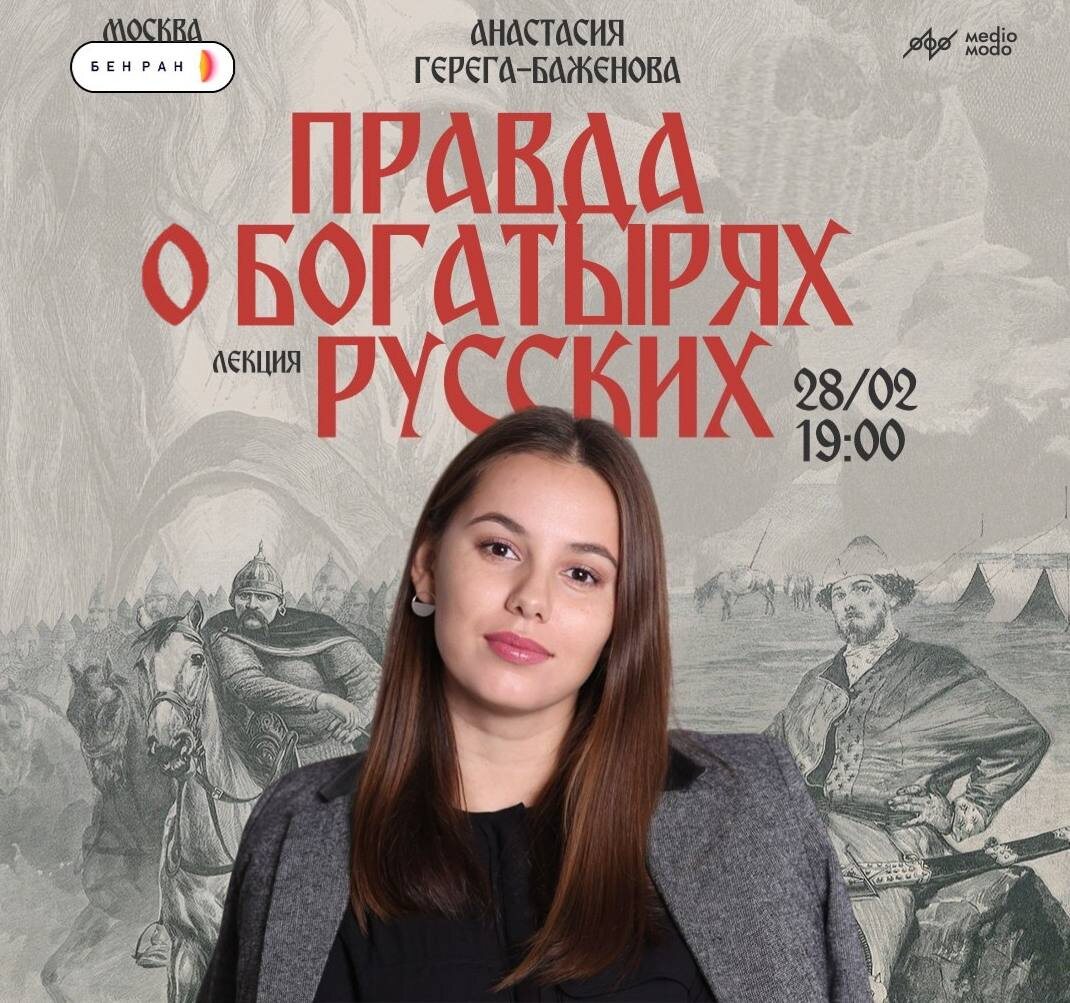 ! Анастасия Герега-Баженова, автор телеграм-канала «Дикая в поле», приглашает 28 февраля в 19:00 по адресу г. Москва, Малый Знаменский пер. 11/11 на лекцию о богатырях. На встрече обсудим: • кто стоял за образами Ильи Муромца, Добрыни Никитича и Алеши Поповича. Где проходит грань между историческим прототипом и мифологическим героем; • что такое структура былинного мира. Как устроено эпическое пространство («свой» мир vs. «чужой») и какую роль в нем играет богатырь-защитник; • про уникальный феномен богатырш (полениц) в славянском эпосе. Настя-королевична, Василиса Микулишна и другие — воительницы, нарушительницы традиционных ролей; • как менялся идеал богатыря от древних былин до картин Васнецова, фильмов и современных медиа. Какие смыслы он несет сегодня. Лекция основана на исследованиях в области фольклористики, истории и культурологии • Билеты: clck.ru/3NTLzt