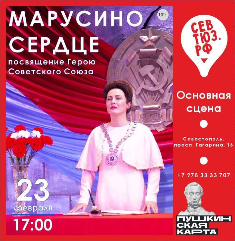 🎭 Сходим на спектакли «Марусино сердце» и «Сашка» В День защитника Отечества, 23 февраля, мы покажем спектакли о наших защитниках, об их ратных подвигах на фронтах Великой Отечественной войны и трудовых подвигах в мирное время. Это постановки, в которых звучат голоса прошлого, голоса тех людей, которые служили Родине не ради медалей и званий, а ради светлого будущего своей Отчизны, ради всех нас. 👉 Когда? 23 февраля в 17:00 👉 Билеты на сайте севтюз.рф или в кассах театра: просп. Гагарина, 16 и ул. Правды, 13. Принимаем оплату Пушкинской картой. 👉 Касса: +7(978)333-37-07 Онлайн-касса на спектакль «Марусино сердце» Онлайн-касса на спектакль «Сашка» ✨Давай сходим, Севастополь | Читайте и смотрите нас в МАХ