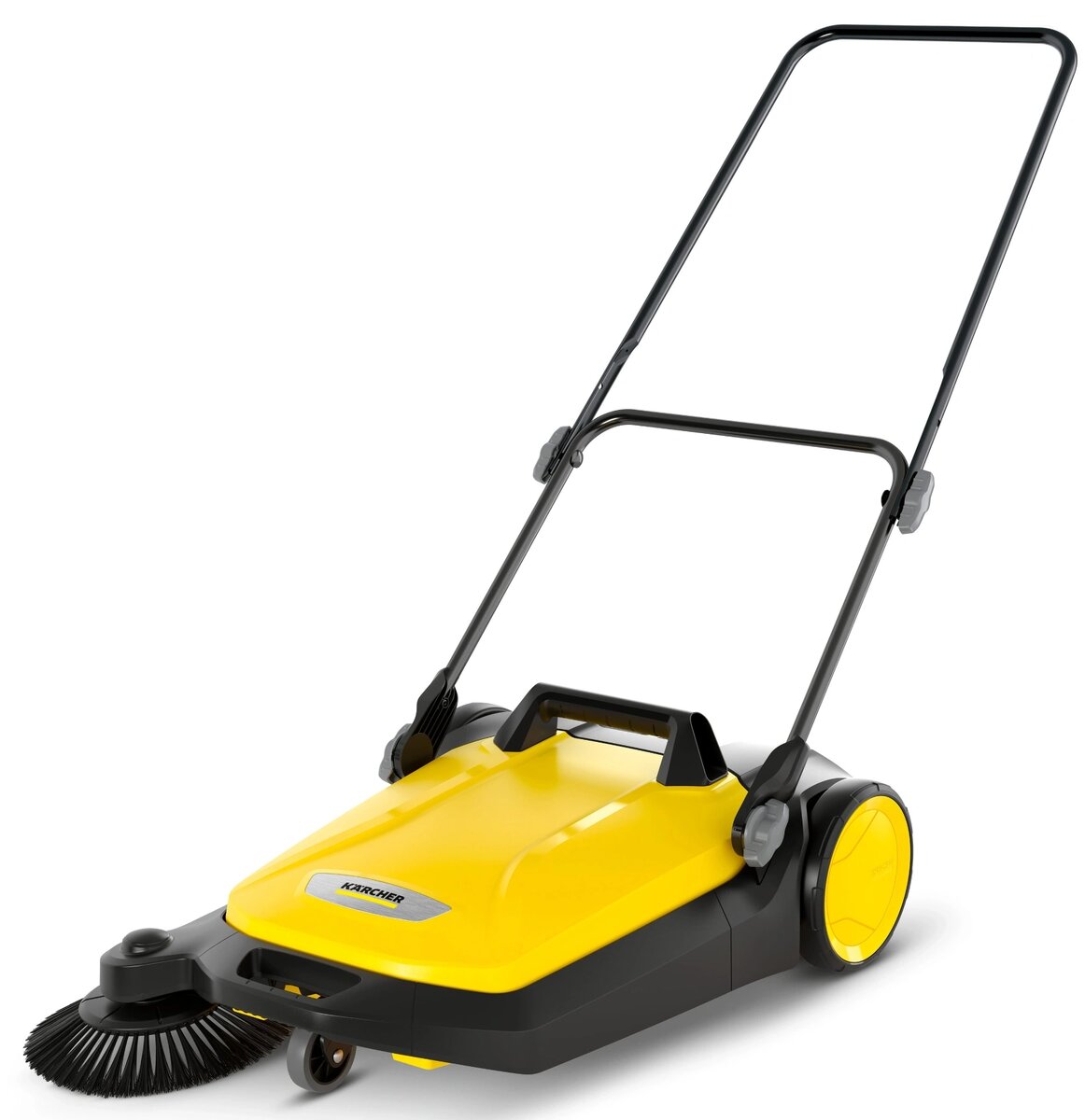 Kärcher S 4 — универсал. Сухие листья? Легко. Влажный песок? Без проблем. Даже мелкий гравий или опавшие цветы — все в контейнер. Щетки крутятся от движения колес, так что энергия ваша, но усилий минимум. Это как велосипед: толкаешь — и едешь, но здесь вместо скорости — чистота.