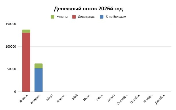 Всех приветствую, Прошел второй месяц года заодно последний месяц зимы. Можно подводить итоги по денежному потоку. Январь 2026го начался отлично: 137.467 рублей А вот за февраль результат скромнее, но тоже хорошо: 62.170 рублей В целом начало года идет не плохо за 2 не самых жирных месяца я получил 20% от планового годового поступления. Дивиденды, купоны по основному портфелю (ИИС и Домик у Моря сюда не входят). Так же сюда относятся проценты (после закрытия вклада) по тем вкладам что я для себя считаю в капитале, а не подушке безопасности. Дивиденды и купоны считаются уже "чистыми" после вычета НДФЛ. Дивиденды: 0 рублей. В марте к сожалению тоже не ожидаю Купоны по облигациям: 10670 рублей в основном купоны по облигациям Полюса (рубли и юани) и Новатэка Проценты по вкладам: 51500 рублей. Закончился один крупный вклад Весь полученный доход, как и весь предыдущий год, был реинвестирован обратно и продолжает работать на меня. Средняя зарплата за 26й год составляет: 99.819 рублей Пригла