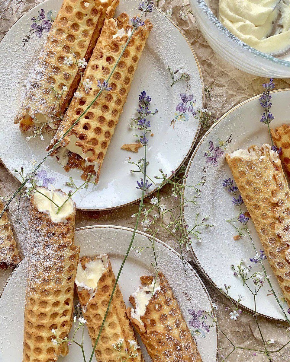 Ингредиенты: ▫️яйца куриные — 2 шт. ▫️сахар тростниковый — 50 г ▫️сливочное масло — 100 г ▫️пшеничная мука — 90 г ▫️разрыхлитель — ½ ч. л. ▫️ванилин — ½ ч. л. ▫️соль — 1 щепотка Масляный крем: ▫️молоко сгущенное — 380 г ▫️сливочное масло — 180 г Способ приготовления: 1. Яйца взбейте со щепоткой соли. 2. Добавьте тростниковый сахар и снова хорошо взбейте (венчиком или миксером). 3. Влейте растопленное сливочное масло и хорошо перемешайте. 4. В отдельной посуде смешайте пшеничную муку (просейте), разрыхлитель и ванилин. Всыпьте к яичной массе и хорошо смешайте венчиком. 5. Вафельницу хорошо разогрейте (примерно 2 минуты), кисточкой смажьте поверхность растительным маслом (смазывайте перед выпеканием каждой трубочки) и выложите одну столовую ложку теста. Вафельницу закройте и выпекайте вафлю около 30 секунд, а затем быстро сверните в трубочку. 6. Приготовьте крем. Мягкое сливочное масло (достаньте из холодильника за 30 минут) взбейте миксером (около 1 минуты). Постепенно вливайте сгущенно