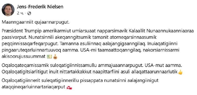 Об этом сообщил глава правительства острова Йенс-Фредерик Нильсен, комментируя заявление президента США Дональда Трампа об отправке к берегам острова госпитального судна для оказания медицинской помощи гренландцам. Спасибо, но нет. Мы узнали, что президент Трамп собирается направить в Гренландию американское госпитальное судно. Но у нас уже есть система здравоохранения, которой каждый может пользоваться бесплатно. Это решение принято не случайно — для общества это принципиально важно. В США такого нет, потому что медицинская помощь там очень дорогая. Мы всегда открыты к диалогу и сотрудничеству — в том числе с США. Только давайте разговаривать напрямую, а не чтобы люди в соцсетях просто так без конца переписывались. Если диалог и сотрудничество возможны, то решения, которые мы принимаем у себя в стране, должны уважаться безусловно 🟪Читай в Max | 🚀Читай в Telegram | 🥰Смотри на RUTUBE