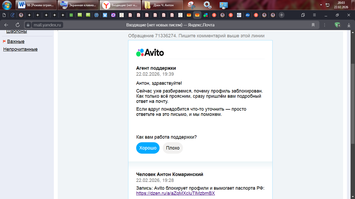 Запись: Avito блокирует профили и вымогает паспорта РФ: https://dzen.ru/a/aZqMXcluTlMzbmBX Далее настоящую запись направляю на адрес электронного почтового ящика: ads_support@avito.ru 22 дня месяца Февраля 2026 года время 19:27, с почтового ящика: tchel.a.m.komarinsky@ya.ru Еще далее с адреса электронного почтового ящика: Служба поддержки Авито support@avito.ru поступил 22 дня месяца Февраля 2026 года время 19:32, ответ: Здравствуйте, получили ваше обращение. Вот его номер: 71336274. Сейчас мы уже начали изучать все детали. Как только разберёмся, сразу же вернёмся с ответом. Обычно на это нужно не больше суток. Иногда можем задерживаться, если обращений слишком много — но в любом случае постараемся ответить поскорее. А еще далее этого же дня время: 19:39 поступил также ответ: Агент поддержки Антон, здравствуйте! Сейчас уже разбираемся, почему профиль заблокирован. Как только всё проясним, сразу пришлём вам подробный ответ на почту… Самое главное результата положительного не ждите, по