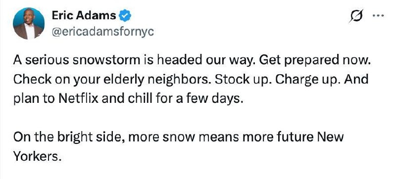 Eric Adams tells New Yorkers to stay inside and ‘Netflix and chill’ to make ‘more future New Yorkers’ ahead of ‘historic blizzard’