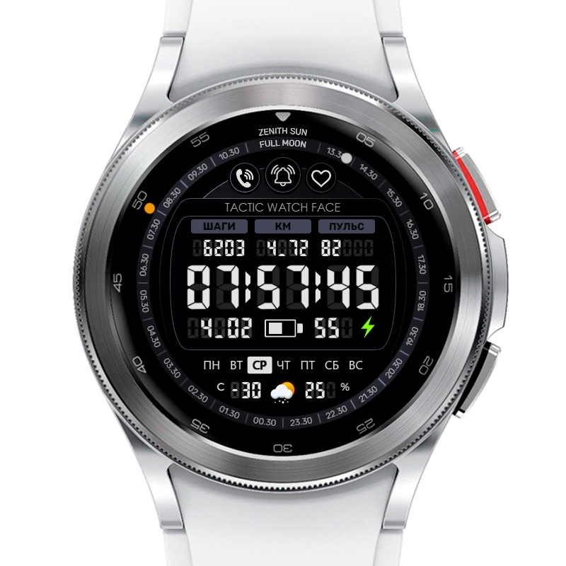 Циферблат имеет следующие усложнения: - Счётчик шагов - Пульсометр - Пройденное расстояние (км) - число, месяц, день недели - Уровень заряда (зелёная иконка становится красной при уровне заряда 20% и ниже) - Температура воздуха и вероятность осадков - Погодный виджет - Фазы Луны и положение Солнца - Тап-зоны (вызов, будильник, параметры пульса, календарь) Цветовых схем нет. Экран AOD есть.