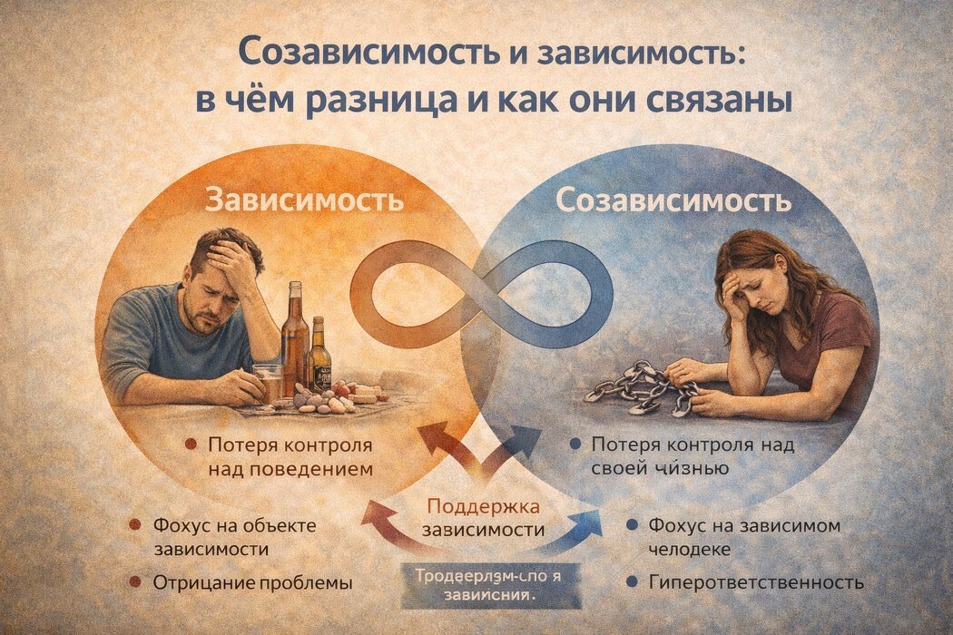 Созависимость же — это психологический паттерн, при котором жизнь, эмоции и самооценка человека чрезмерно зависят от другого, чаще всего от зависимого партнёра.