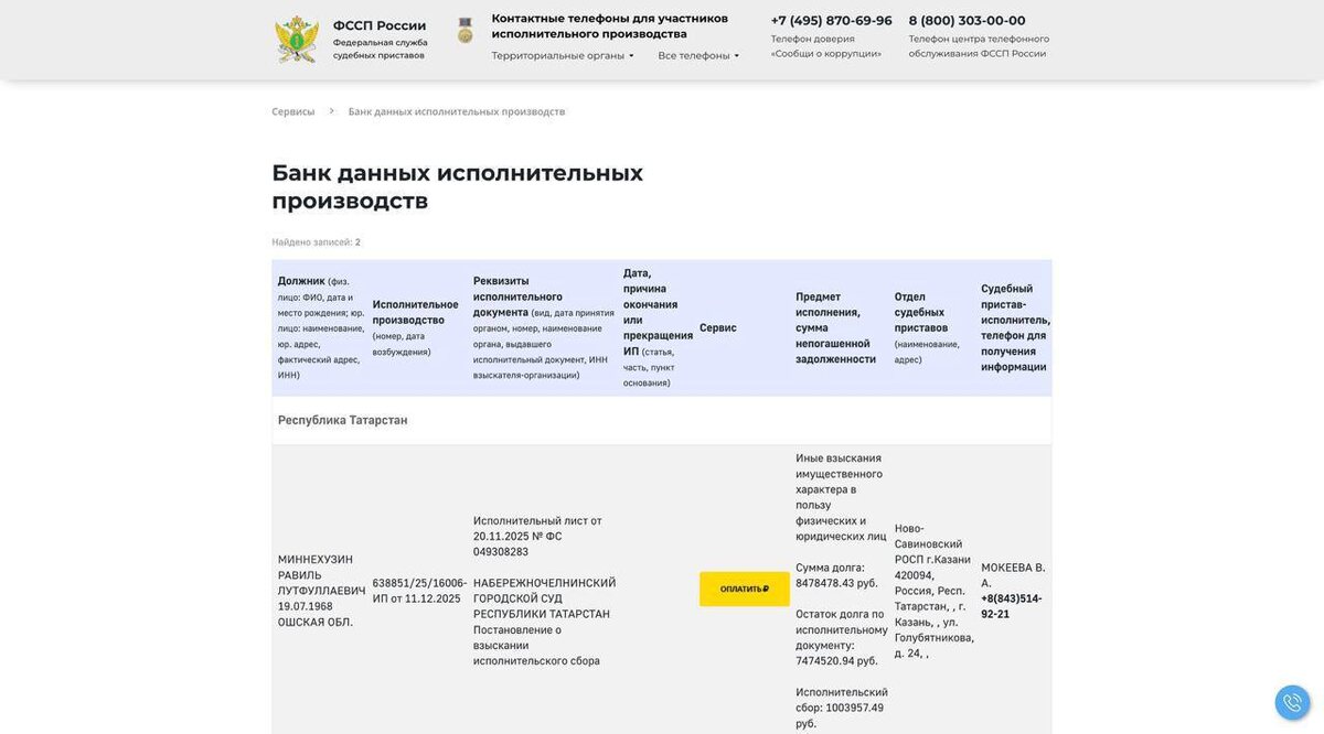 , выявлены долги на сумму более 8 млн рублей — такие данные приводятся в базе судебных приставов. При этом ранее в декларациях о доходах указывались значительные суммы. Так, за 2021 год Миннехузин задекларировал доход в 80,5 млн рублей, его супруга — 193,6 млн рублей. В собственности семьи значатся десятки объектов недвижимости, включая 50 квартир, жилые дома и коммерческие здания, а также автомобили Bentley Continental GT Speed, «ГАЗ-3110» и «ГАЗ-21». ⭐️ Татарстан News 📲 Татарстан News в MAX