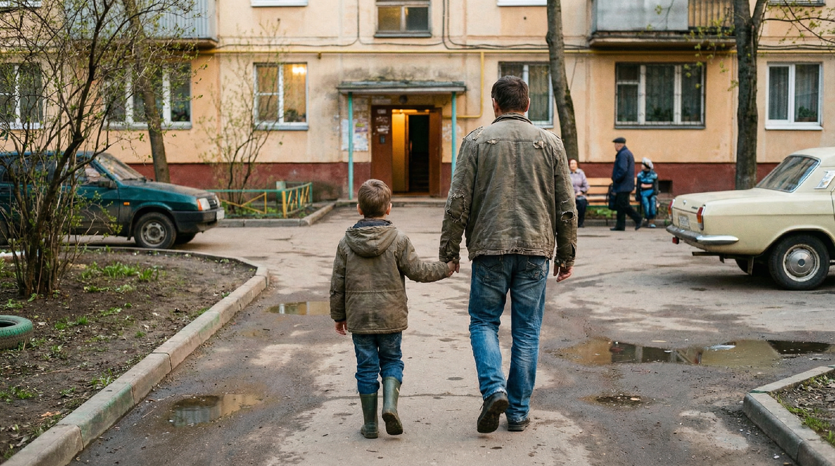 Я обернулась. На пороге стоял мой пятилетний сын. А рядом с ним – мужчина. Высокий, худой, в куртке, которая когда-то была синей. На ногах – разбитые ботинки, замотанные изолентой у подошвы. Запах – не резкий, но заметный. Пот, сырость, улица.