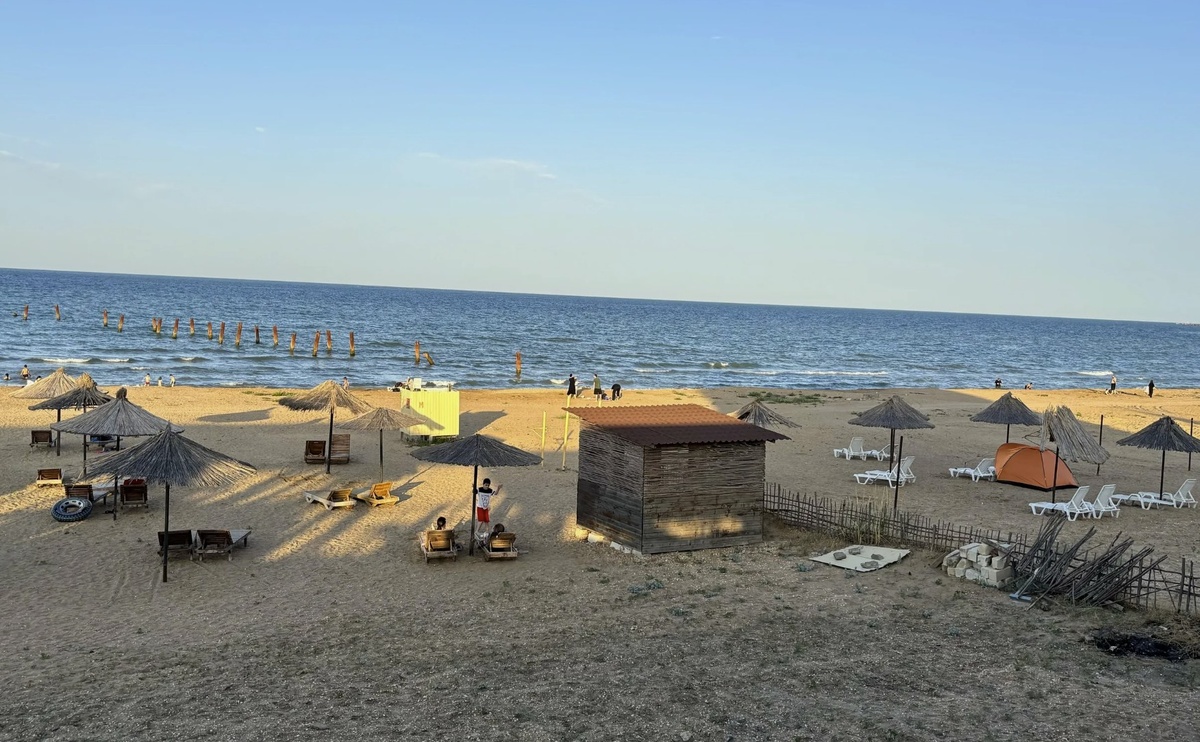 Пляж тянется длинно, прям длинно, можно идти и идти. Ближе к центру больше навесов и лежаков, есть кабинки для переодевания, несколько частных зон. Я сначала расположилась там, потому что хотелось понять, где удобнее заходить в воду. Людей в этой части больше, зато вход в море аккуратнее, без резких перепадов. Через 10-15 минут я уже отплыла подальше, вода солоноватая, плотная, Каспий всё таки.