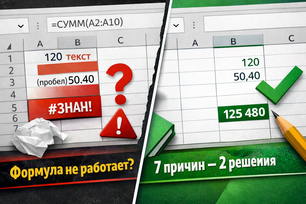 Формула работает у коллеги, но ломается у тебя: 7 реальных причин и пошаговая диагностика. Разбор 7 реальных причин, почему формула считает у коллеги и ломается у вас: текст вместо числа, пробелы, формат, разделители, ссылки. Пошаговая диагностика + файл для практики. В прошлых сериях мы говорили о типичных ошибках формул. Теперь — другой уровень. Одна и та же таблица. дин и тот же файл. У коллеги — всё считает. У вас — ошибка или странный результат. Это не магия. Это системная причина. Сегодня разберём 7 сценариев, которые ломают расчёты, и пройдём диагностику так, чтобы вы могли применить её к любой своей таблице. В Telegram лежит файл с 7 реальными кейсами — сможете повторить всё руками. Есть простая формула: =СУММ(A2:A10) У коллеги результат: 125 480. У вас: 0. Вы перепроверяете диапазон — тот же. Копируете формулу — то же самое. Сумма не считается. Начинаем диагностику. Выделите диапазон → посмотрите формат в верхнем меню. Если стоит Текст, Excel воспринимает числа как строки. Как