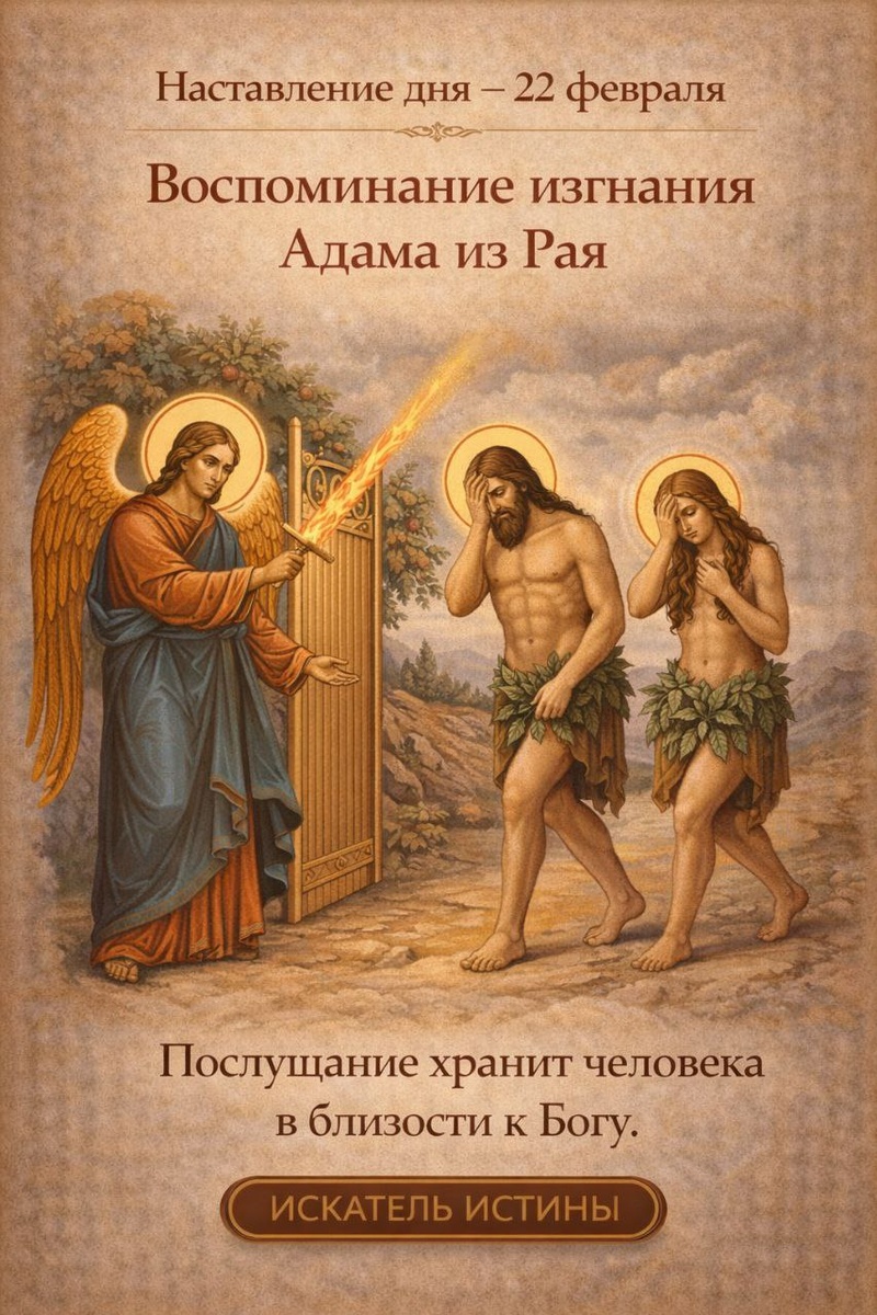 Воспоминание изгнания Адама из Рая В этот день Церковь вспоминает изгнание прародителей из Рая. Это событие напоминает о начале человеческой истории вне райского общения с Богом. Грех Адама был не просто нарушением заповеди, а разрывом доверия. Человек предпочёл свою волю Божией. Именно это стало причиной потери райской близости. Изгнание из Рая — не только наказание, но и урок. Господь не уничтожил человека, но оставил ему путь возвращения через покаяние и труд духовной жизни. Церковь напоминает нам, что каждый грех — это удаление от Бога. И каждый шаг к покаянию — это движение назад к утраченной близости. Этот день особенно учит смирению. Человек не может спасти себя своими силами. Но он может признать ошибку и обратиться к Богу. Память изгнания Адама призывает нас хранить послушание и быть внимательными к своему сердцу, чтобы не повторять древнего падения.