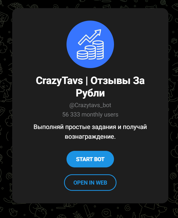 Давайте поближе знакомиться с нашим сегодняшним пациентом t me/Crazytavs_bot, который невероятно гордо и пафосно именует себя передовой платформой для заработка на совершении простых действий в сети. Если свято верить предоставленной создателями статистике, которая, к слову, вызывает просто гигантские сомнения у любого здравомыслящего человека, ежемесячно этот виртуальный помощник собирает вокруг себя аудиторию в сорок пять с лишним тысяч активных человек. Звучит это так, словно население целого небольшого городка внезапно бросило свои основные работы и решило стать миллионерами, не вставая с продавленного домашнего дивана. Неизвестные разработчики этого чуда программной мысли обещают настоящие золотые горы за выполнение совершенно элементарных и даже примитивных вещей: заполнение скучных анкет, бесконечную рассылку рекламных ссылок по списку своих друзей, подписку на различные сомнительные каналы и написание хвалебных комментариев абсолютно незнакомым компаниям в сети. За одно такое нехитрое и быстрое действие вам сулят невероятно щедрое вознаграждение вплоть до сотни полновесных рублей.