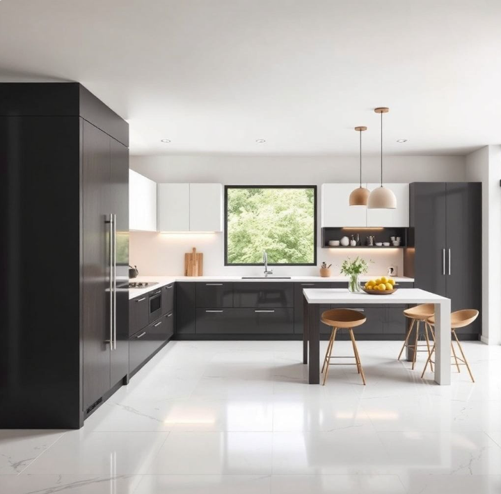 Минимализм: монохромная гамма, скрытые ручки, прямые линии. Создаёт ощущение порядка и чистоты. Представьте кухню с чёрными фасадами, белой столешницей и скрытыми ручками. Минимум аксессуаров, только самое необходимое — и ваша кухня будет выглядеть стильно и современно.