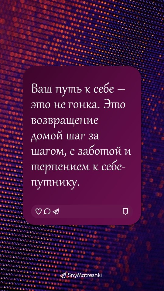 Иногда нам нужна не длинная статья, а одна точная фраза — чтобы опереться, выдохнуть и почувствовать: «это про меня». Эта рубрика — коллекция таких фраз. «Внутренний голос» для тех, кто на пути к себе. Сохраняйте ту, что нашла в вас отклик сегодня. Поддержать автора Александра Бóгдан,
