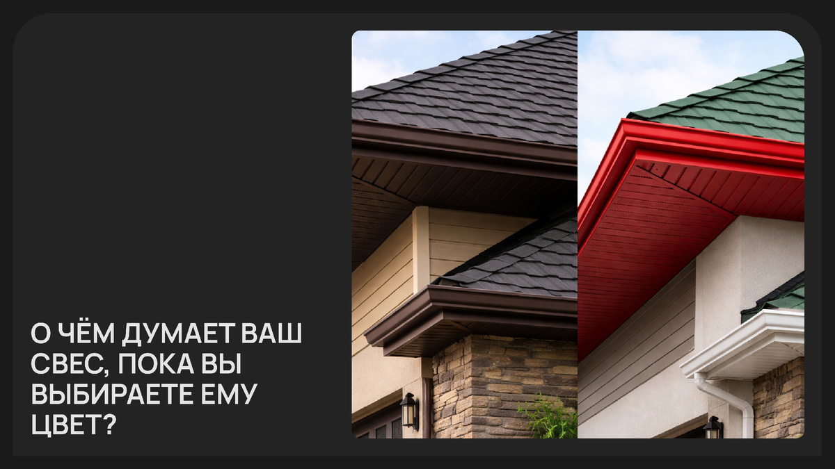 Представьте соседа. У него тёмно–зелёная металлочерепица. А свесы он, «чтобы было веселее», сделал кирпично–красными. Теперь его дом смотрится не как единое целое, а как конструктор, собранный из разных коробок. Глаз цепляется за этот диссонанс, и всё впечатление от добротной постройки летит в тартарары. Потому что свес — логическое завершение крыши. Он должен либо сливаться с ней, либо быть её скромным, но стильным акцентом. Есть железное правило, которое нарушают только те, кто хочет, чтобы их дом выглядел как местный фрик: Цвет свеса должен сочетаться с цветом кровли или быть нейтральным фоном для фасада. Есть же