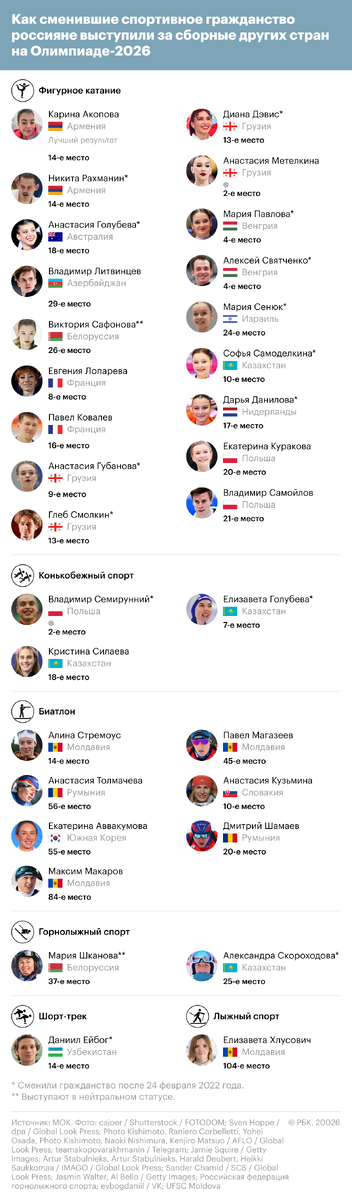 Они завоевали два серебра — это сделали конькобежец Владимир Семирунний (Польша) на дистанции 10 000 м и Анастасия Метелкина (Грузия) в парном катании Более 30 сменивших спортивное гражданство россиян выступили за другие сборные на Олимпийских играх 2026 года. Наибольшее число сменивших гражданство россиян зафиксировано в фигурном катании — 18. Всего они завоевали на Играх в Италии две награды. Представляющий теперь Польшу конькобежец Владимир Семирунний занял второе место на дистанции 10 000 м, а в парном катании выступающая за Грузию Анастасия Метелкина вместе Лукой Берулавой также завоевали серебро. Российские спортсмены, выступающие в нейтральном статусе, завоевали в Милане и Кортина-д'Ампеццо только одну медаль — ски-альпинист Никита Филиппов стал вторым в спринте. Больше новостей в телеграм-канале «РБК Спорт». Читайте также: У резиденции Трампа во Флориде застрелили мужчину