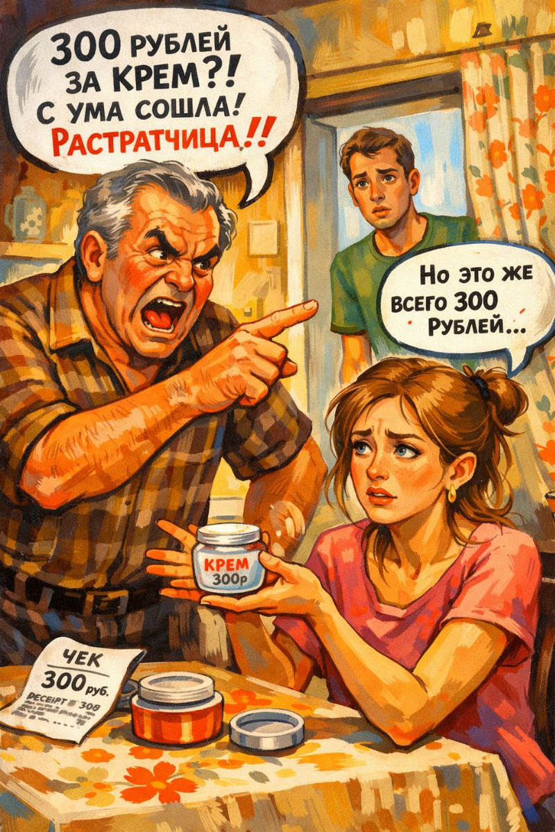 — Вот! — свекор сунул ему под нос чек из магазина. — Смотри, сколько я на вас трачу! Две тысячи! На продукты! А ты еще защищаешь свою женушку, когда она кремы за тысячу покупает!