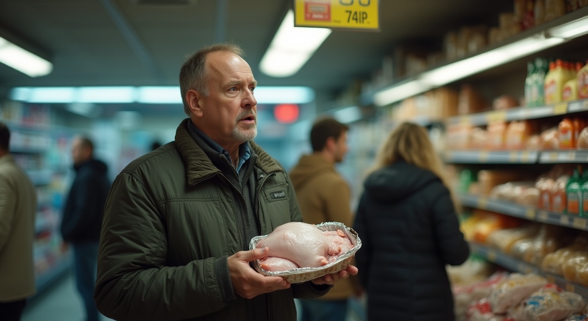 Первый тревожный звоночек был тихим: на полке под лотками с курицей висел ценник, от которого, как он признался, у него «перехватило дыхание». Цена за килограмм выглядела как сумма, которую он обычно оставляет за три-четыре позиции. Мужчина аккуратно взял упаковку, переложил в другую руку, будто проверяя вес, и вгляделся в этикетку. По словам очевидцев, он пошел к сканеру самообслуживания — вдруг ценник не тот? Сканер показал еще выше. Он вернулся к полке, перелистал лотки, посмотрел, не перепутали ли сорт, клеймо, дату, иногда это бывает. Сердце у него колотилось: «Да ну, не может быть», — пробормотал он, а рядом уже начали останавливаться люди, переговариваться: «Видели? Вы видели? Это что вообще?»