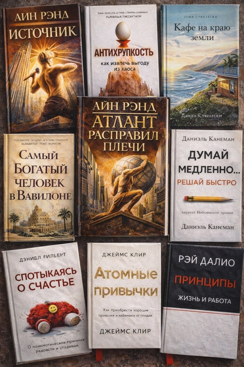 И собрали подборку книг, которые помогут шире взглянуть на происходящее вокруг предпринимателя. 0. «Принципы» Рэй Далио - быть честным с собой и слушать оппонентов для выявления слепых зон. 1. «Атлант расправил плечи» Айн Рэнд. О чем: Про ответственность за результат. 2 «Антихрупкость» Насима Талеба. Книга про то, что устойчивость - это не цель. 3 «Самый богатый человек в Вавилоне» Джорджа Клейсона. Про фундамент: дисциплина, накопление, уважение к деньгам. 4. «Думай медленно... решай быстро», Даниэль Канеман Про то, как мы ошибаемся. 5. «Спотыкаясь о счастье», Дэниел Гилберт О чём: чего мы на самом деле хотим 6. «Атомные привычки», Джеймс Клир О чём: Как маленькие изменения каждый день дают большой результат. 2 книги, не вошедших в рейтинг,но по моему личному мнению они должны быть: «Кафе на краю земли» Джона Стрелеки - переосмыслить рутину, страхи и истинные желания. «Источник» Айн Рэнд - о праве человека быть источником своих решений.