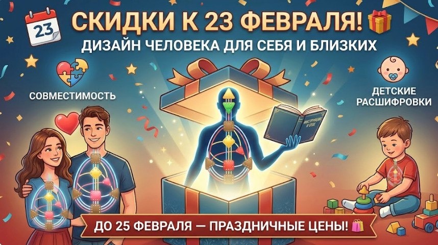 🎁🎉 ДИЗАЙН ЧЕЛОВЕКА ДЛЯ СЕБЯ И БЛИЗКИХ 💡 23 февраля — повод сделать подарок. Себе или тому, кто важен. 🎁 Расшифровка карты — это инструкция к себе: как принимать решения, где ваша сила и как её раскрыть. 📖 Расшифровка совместимости покажет, как вы влияете друг на друга с конкретным человеком — и почему возникают конфликты. 🔍 А на детские расшифровки тоже снизили цены — вдруг пригодится. 👶 Если вы давно хотели получить расшифровку карты — сейчас идеальный момент. Это подарок, который не ляжет в ящик. Подходит всем, независимо от возраста и пола. 🎯 До 25 февраля действуют праздничные цены. 🛍️ https://human-design.space/category/platnye-rasshifrovki/