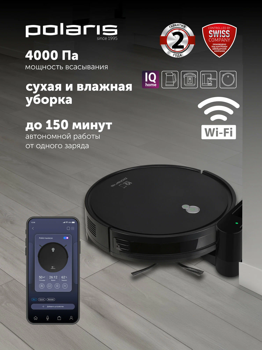 Ну что, поделюсь своими впечатлениями о роботе-пылесосе Polaris! Долго выбирала модель, изучала характеристики, и в итоге остановилась на этой модели, приобрели на Яндекс Маркет — и ни разу не пожалела! С самого начала меня поразила простота подключения. Скачала приложение IQ Home (на Android, на IOS), подключил пылесос к Wi-Fi — и вуаля, он уже готов к работе! Сделал привязку к Алисе (умный дом), прописал сценарии, и теперь можно запускать уборку через команды, пока занимаюсь другими делами, или даже когда меня нет дома. Это просто магия! Уборка — это его конёк! Этот малыш справляется на ура: собирает и шерсть, и пыль, и даже мелкие крошки. Особенно радует комбинированный режим сухой и влажной уборки — полы после него просто сияют. Больше не нужно тратить время на мытьё полов вручную! Автономность — просто восторг! До 150 минут работы от одного заряда — этого хватает, чтобы убрать всю квартиру (у меня 58,8 м²). Когда заряд заканчивается, пылесос сам возвращается на базу. Очень удобно!