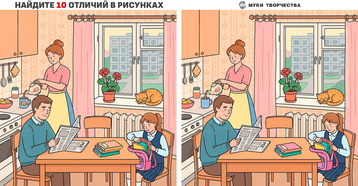 Перед вами уютная задачка на внимательность. Есть две похожие картинки с утренними сборами в школу на кухне. В одной картинке художник сделал 10 отличий. Обнаружьте все отличия самостоятельно, не прибегая к подсказке, которая будет в конце статьи. Используйте её позже для сверки результатов. Такая гимнастика полезна для работы мозга. Горизонтальный тест на внимательность: Утро перед школой Вертикальный тест на внимательность: Утро перед школой ОУ! Тут ещё Больше тестов: А НИЖЕ ОТВЕТ-ПОДСКАЗКА: