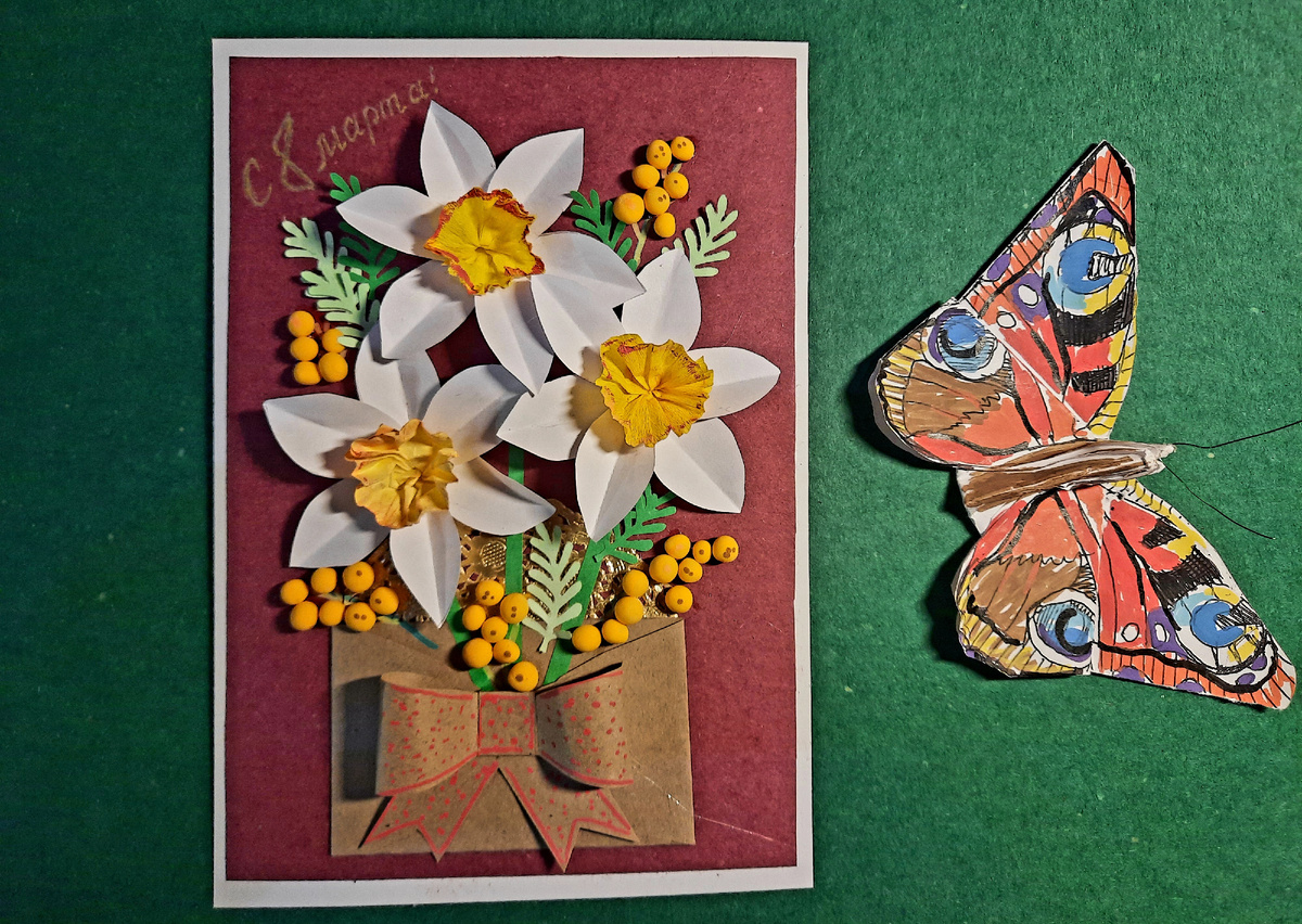 Несложная в изготовлении, но затейливая открытка с элементами объёма поможет создать весеннее настроение и дополнит ваш подарок на 8-е марта. Для основания открытки использован цветной картон размером 19Х14 кв.см. Цветной картон наклеивается на белый размером 20Х15 кв.см., так чтобы образовалась белая рамочка. Для конверта я использовала крафтовую бумагу, но годится и любая цветная. Сначала лучше сделать шаблон. Верхнюю закрывающуюся часть конверта можно сделать по аналогии с нижней. А я использую для этих целей половину золотой ажурной салфетки. Конверт приклеиваю на картон и добавляю стебли будущих нарциссов. Для цветов использую обычную белую офисную бумагу. Каждый лепесток складываю вдоль по центру. Собираю цветок из двух частей и готовлю середину из гофрированной бумаги. Если последней нет, то можно просто помять и заложить складочками полоску офисной бумаги. Полоску нужно склеить так, чтобы получилось кольцо. А кольцо связать нитками. Можно потом подрезать нижнюю часть чуть