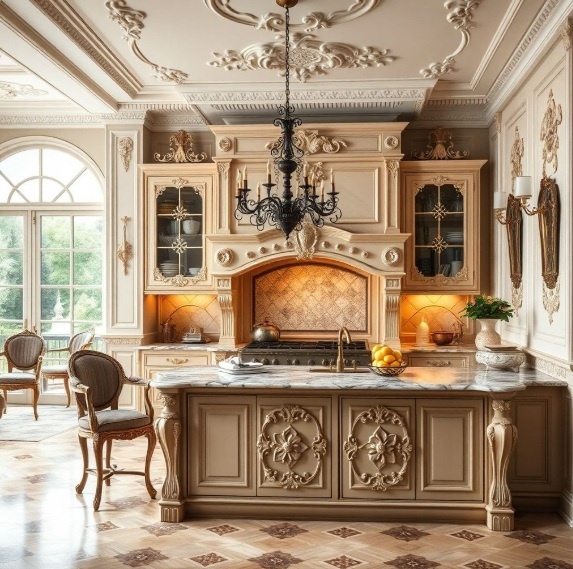 - Классика и неоклассика. Фрезеровка, патина, декоративные карнизы, стеклянные вставки. На фото проверьте, не перегружен ли интерьер деталями, которые усложняют уборку. Практический совет: выбирайте классические элементы только на верхних фасадах, нижние делайте более лаконичными для удобства эксплуатации.