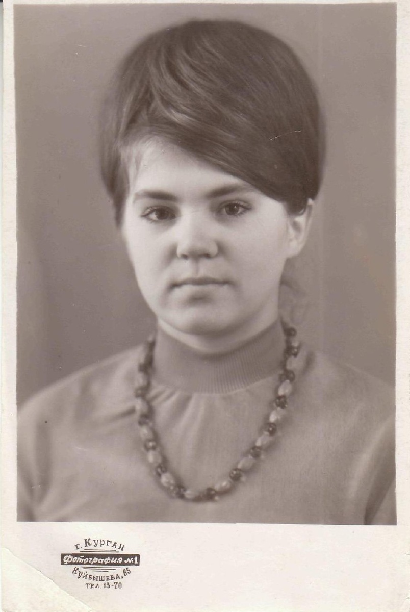Фото ч/б, глянцевое портрет погрудный молодой женщины с бусами. Ателье г. Курган Куйбышева 65. 1964г. | 1964 г.