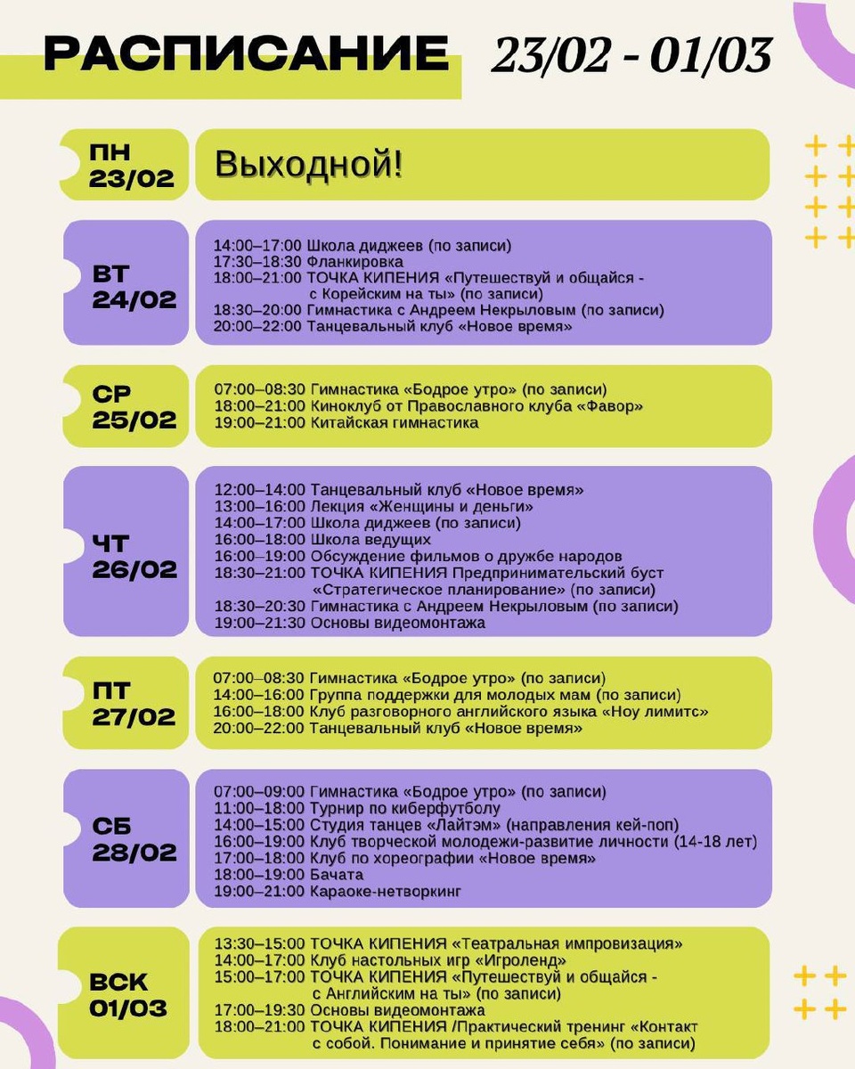 Неделя, где можно попробовать новое, прокачать навыки и просто провести вечер с пользой. Пространство «Точка кипения — Сочи» собирает очень разную аудиторию — от языковых клубов до практических тренингов. В программе: — «Путешествуй и общайся — с Корейским на ты» Неформальный разговорный формат для тех, кто хочет начать говорить и не бояться ошибок. — Предпринимательский буст «Стратегическое планирование» О целях, системности и развитии проектов — практический взгляд без абстракций. — «Театральная импровизация» Свобода реакции, уверенность, работа с голосом и телом. — «Путешествуй и общайся — с Английским на ты» Живая практика английского через диалог и реальные ситуации. — Практический тренинг «Контакт с собой. Понимание и принятие себя» Про внутреннюю опору, осознанность и спокойную работу с собой. — Гимнастика Запись по телефону: +7 918 304-85-88 — Клуб «Новое время» Регистрация через Telegram-бот: @crm_molodsochi_bot Если остались вопросы — администратор Дома Молодёжи: +7