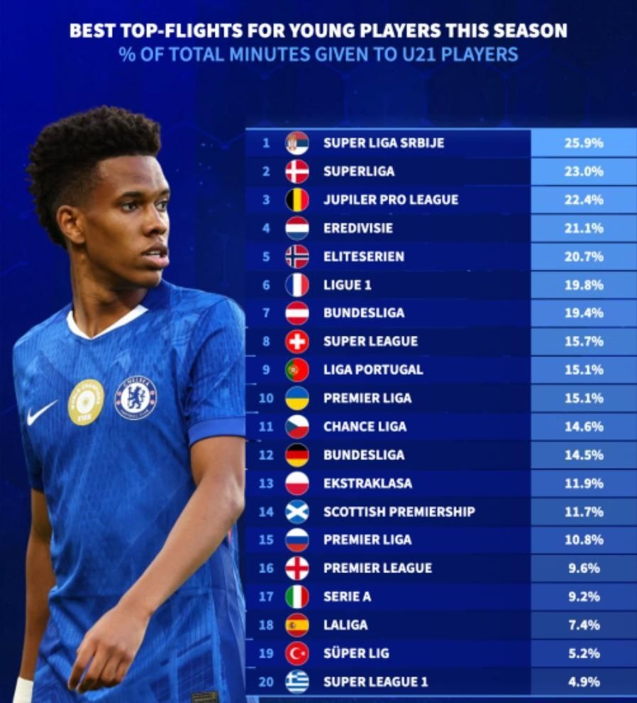 ● Лидирует сербская СуперЛига – там молодые игроки провели более четверти от общего времени (25,9%), далее – датский (23%) и бельгийский (22,4%) высшие дивизионы ● РПЛ с 10,8% не входит в лидирующую группу, но опережает топовые АПЛ (9,6%), Серию А (9,2%) и Ла Лигу (7,4%) ⚽️ Подписывайтесь на нас в MAX